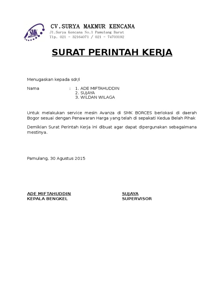 Contoh Surat Perintah Kerja Spk Surat Kerja Anisasi